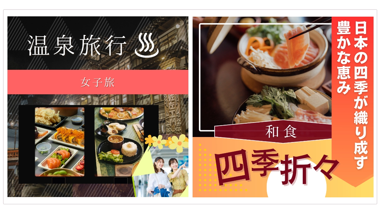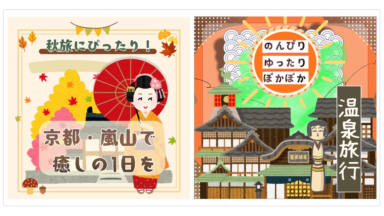 🔱制作のポイント本作品は、行楽や旅行、グルメなどのお出かけシーンをテーマに、さまざまな過ごし方を提案するSNS投稿用バナーです。 イラストと実写の2パターンを用意し、それぞれ異なる雰囲気や訴求に対応できる構成としています。 イラストバージョンでは、京都観光や温泉旅行をイメージし、やわらかく親しみやすいタッチで、季節感や旅の楽しさを表現しています。 一方、実写バージョンでは、温泉や食事シーンの写真を用いることで、現地での体験や魅力をより具体的に伝える構成としました。 それぞれのデザインにおいて、行き先や過ごし方のイメージが直感的に伝わるよう、要素の配置や視線誘導を意識しています。 また、行楽シーズンの告知や旅行プランの紹介、グルメ特集など、用途に応じた展開が可能なレイアウトとしています。 ※実務を想定して制作しています。 ⚜️クレジット
