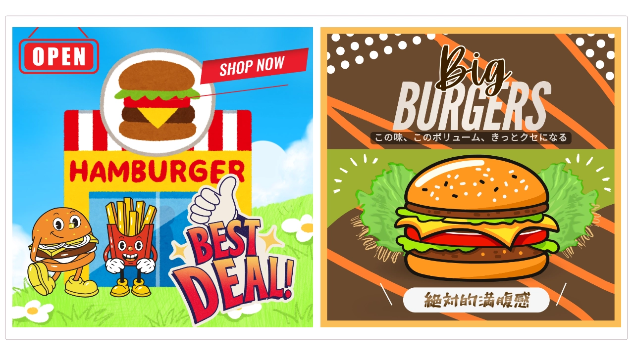 🔱制作のポイント本作品は、SNSやWebサイトでの掲載を想定して制作した、ハンバーガーショップの新規オープン告知バナーです。 実写とイラストの2パターンを用意し、それぞれ異なるターゲット層や利用シーンに対応できる構成としています。 実写バージョンでは、商品写真を使用することで「美味しさ」を直感的に伝え、来店につながる導線を意識した設計としました。 一方、グラフィックバージョンでは、バーガーのイラストを主役に据え、中央に配置したシンプルなパターンと、キャラクター化したバーガーやポテトを取り入れたポップなパターンの2種類を制作しています。 それぞれ、楽しさや親しみやすさを感じられるデザインに仕上げています。 いずれのデザインも、購買意欲を引き出す楽しさやにぎやかさを意識し、ファミリー層や若年層にも訴求できる構成としています。 また、グランドオープンや期間限定メニュー、セール告知など、用途に応じた展開が可能なレイアウト構成としています。 ※実務を想定して制作しています。 ⚜️クレジット
